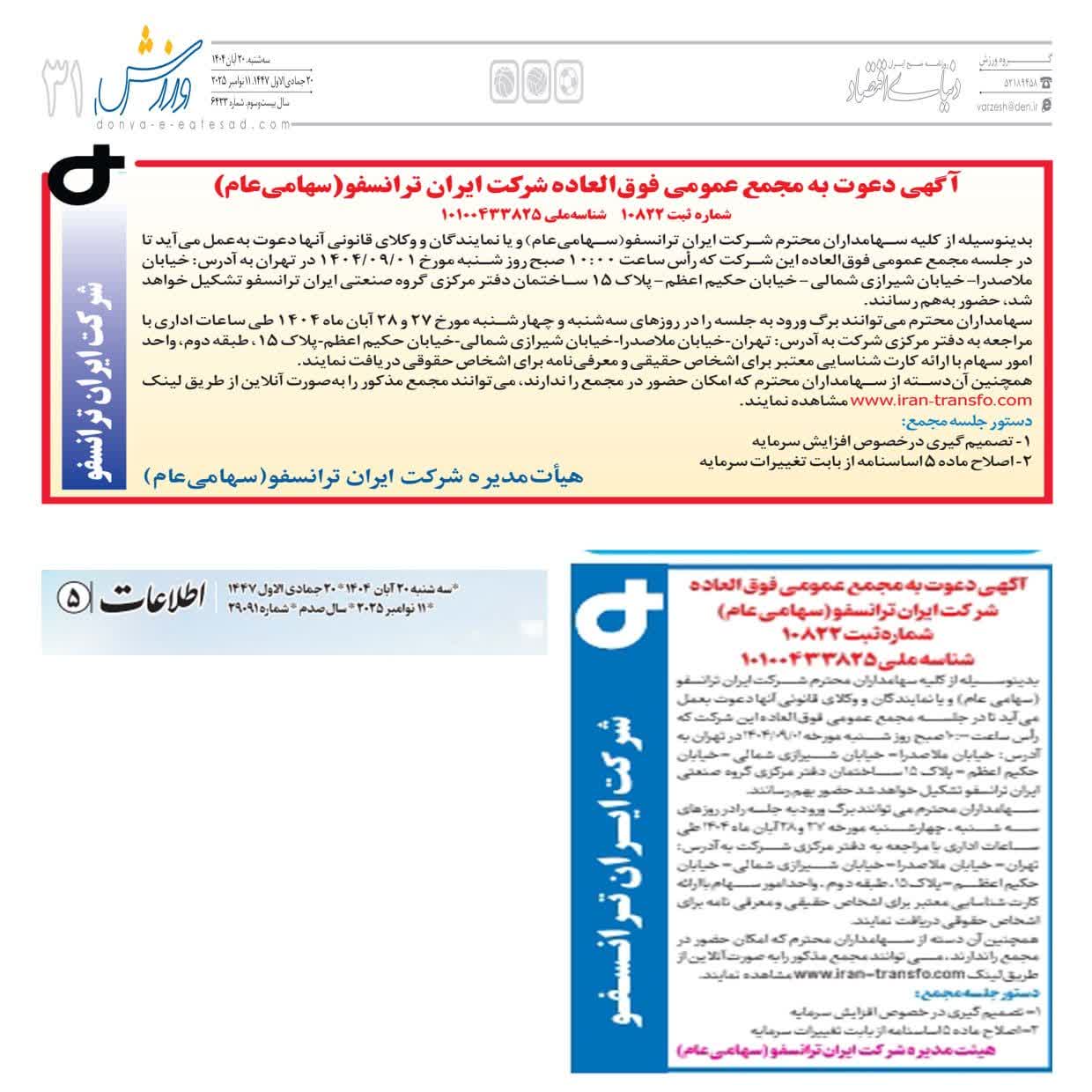 شرکت ایران ترانسفو تولید کننده فعال انواع متنوع ترانسفورماتور با توان 500 MVA، ردیف ولتاژ 420KV، پست های فشار قوی و متوسط، پست های کوچک، مواد عایقی سلولزی، بوشینگ های سرامیکی و تجهیزاتی از قبیل رادیاتورها، کلید های تنظیم ولتاژ Off load،محفظه رطوبتگیر، سیم های مسی با روکش عایق کاغذی، سیم های CTC، روغن ترانسفورماتور و حلال های صنعتی به شمار میرود. در حال حاضر شرکت ایران ترانسفو دارای 15 شرکت اقماری مستقل بوده وبه عنوان بزرگترین شرکت سازنده ترانسفورماتور های قدرت ، فوق توزیع و توزیع در خاورمیانه و تامین کننده 85 درصد از نیاز صنعت برق کشور می باشد. شرکت ایران ترانسفو به عنوان یک شرکت مادر با بیش از 5000نفر نیروی کار مستقیم و غیر مستقیم نه تنها در مقابل معضلاتی چون رکود و تحریم مقاومت نموده است ، بلکه موفقیت های چشمگیری را در حوزه های مختلف تولید، تامین، ساخت داخل، اشتغال و توسعه همه جانبه کسب نموده است تا کنون محصولات این شرکت به بیش از 37 کشور جهان از جمله ترکمنستان، لبنان، سوریه ، عراق، افغانستان، نیجریه ، یمن ، پاکستان ، بنگلادش ، سودان ، لبنان ، سوریه ، نخجوان، آذربایجان، آفریقای جنوبی، لیبی ، اردن ، عمان ، قبرس و.. صادر شده است .